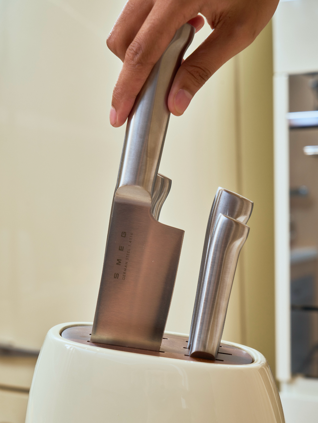 The SMEG knife block set includes a stylish acacia wood block with a durable powder-coated carbon steel frame and a non-slip base for stability.