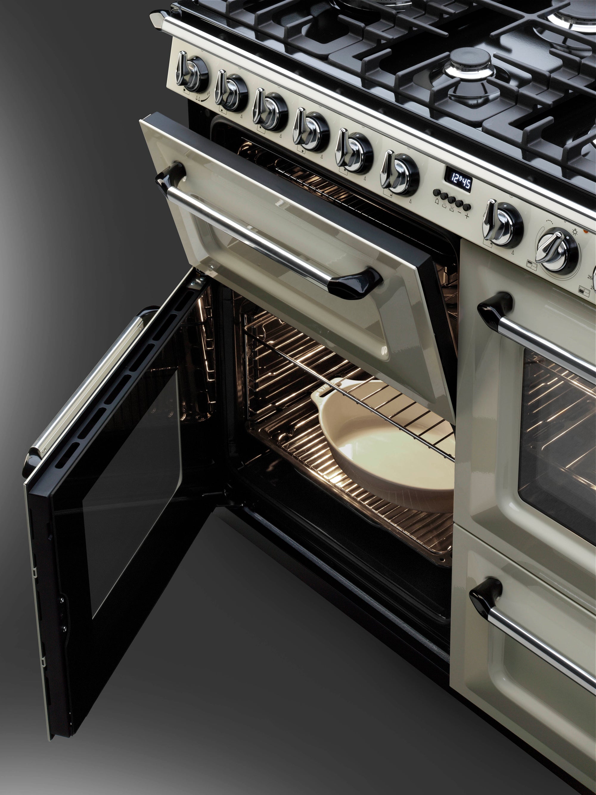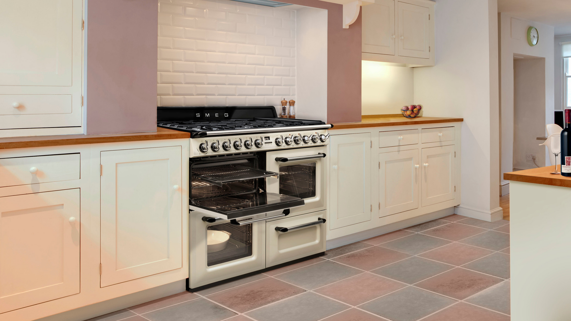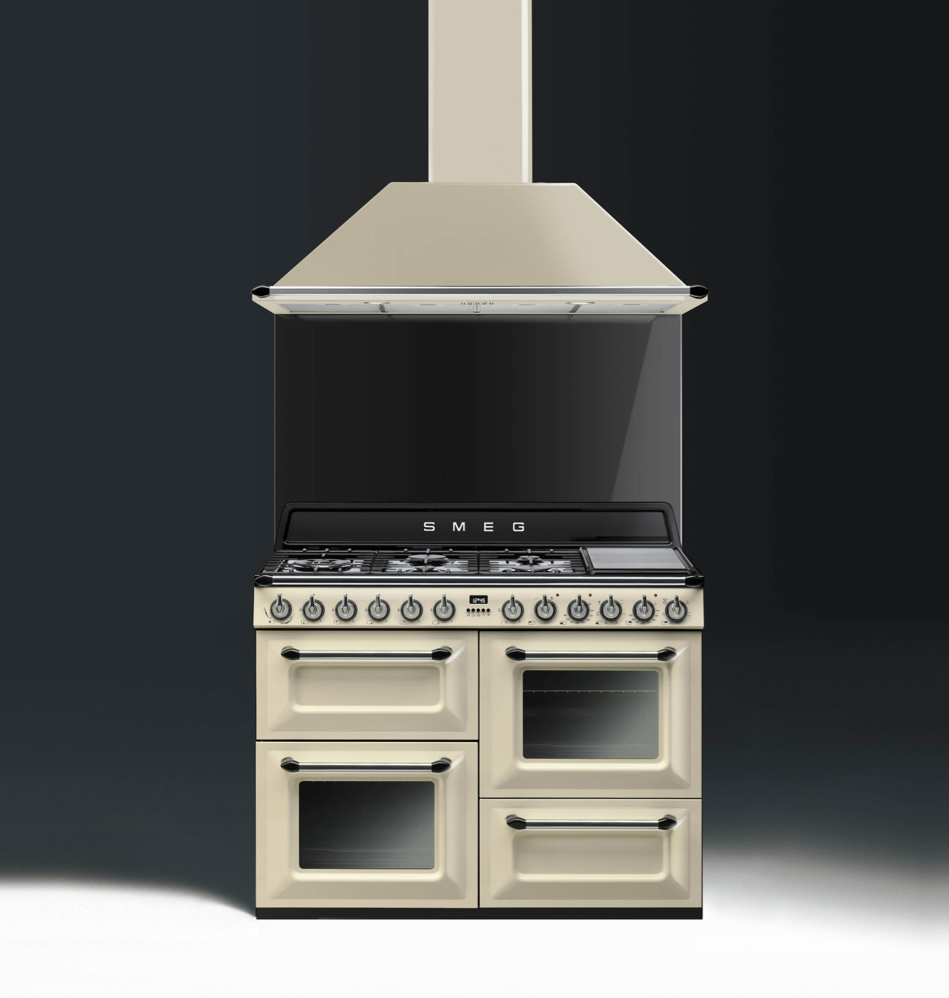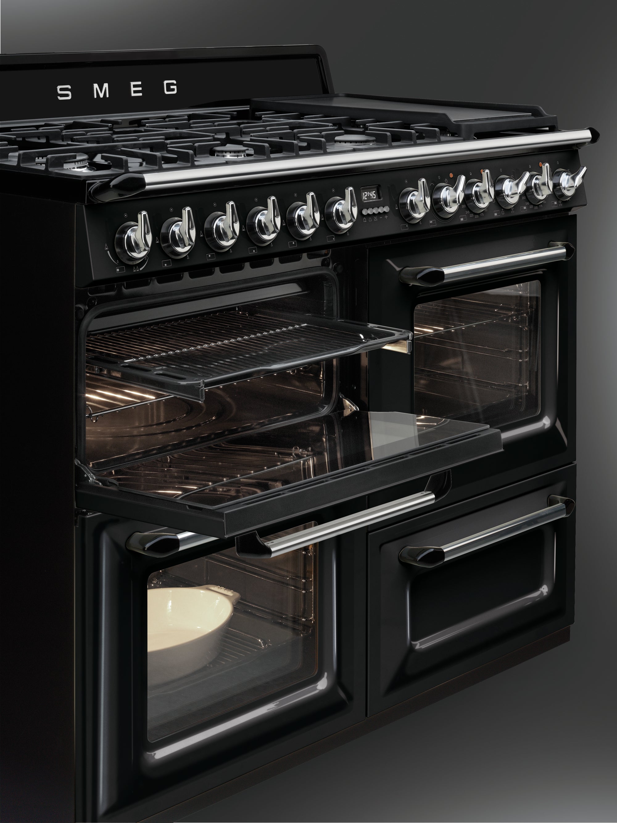 A masterpiece of a cooker, the Smeg Victoria Range Cooker seamlessly blends classic design with top-tier functionality. Featuring three spacious ovens, a storage drawer, and an impressive six gas burners along with a dedicated wok burner, this cooker is designed to handle everything from quick meals to elaborate feasts. The powerful wok burner delivers high-intensity heat for stir-frying, while the multi-function ovens provide precise control for baking, roasting, and grilling. With its combination of vintage aesthetics and modern performance, the Victoria Range Cooker is both a culinary powerhouse and a stunning kitchen centerpiece.